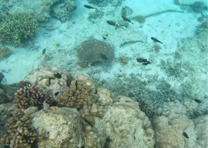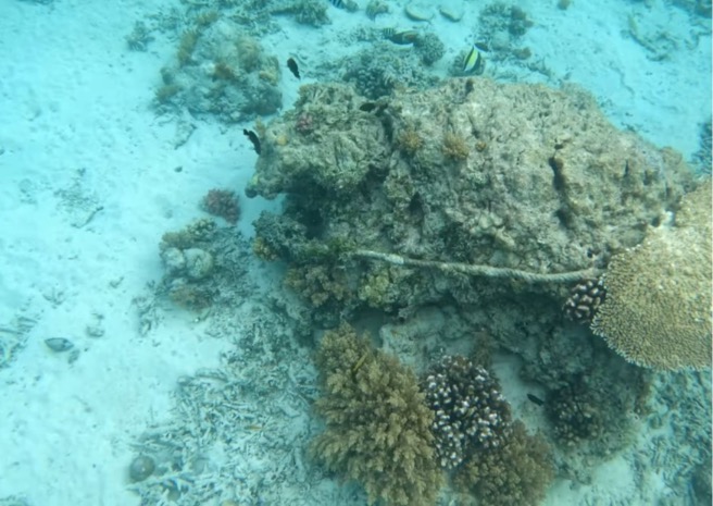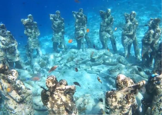 An artistic sculpture now home to thriving coral and colorful fish, offering a surreal snorkeling experience.